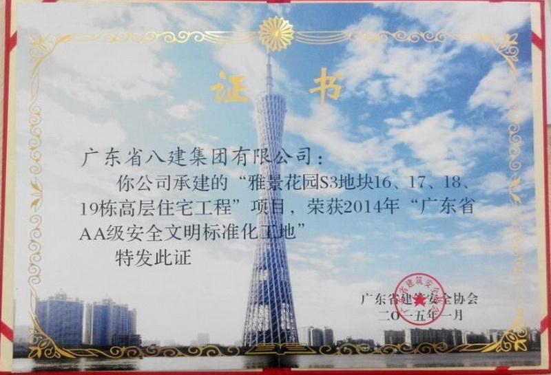 廣東省AA級(jí)文明標(biāo)準(zhǔn)化工地證書(shū)